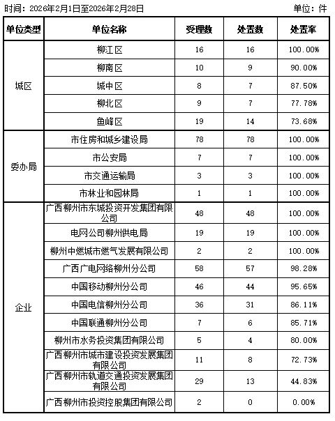 本月各城区及市级专业部门大部分都能按要求及时有效地处理安全隐患类问题。处置率较低的单位有两家:广西柳州市投资控股集团有限公司(受理2件、处置0件);广西柳州市轨道交通投资发展集团有限公司(受理29件、处置13件)。
