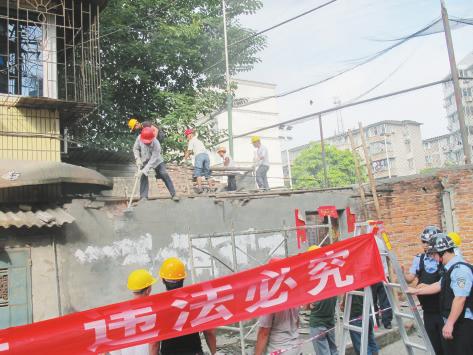 7月23日上午,柳北区执法局对该违法建筑予以拆除(见上图)。“拆得好,拆得好!像这种堵塞道路的违法建筑拆掉了,真是大快人心!”看到工作人员正站在房顶抡着大铁锤拆除违法建筑,路过的居民无不拍手称快。