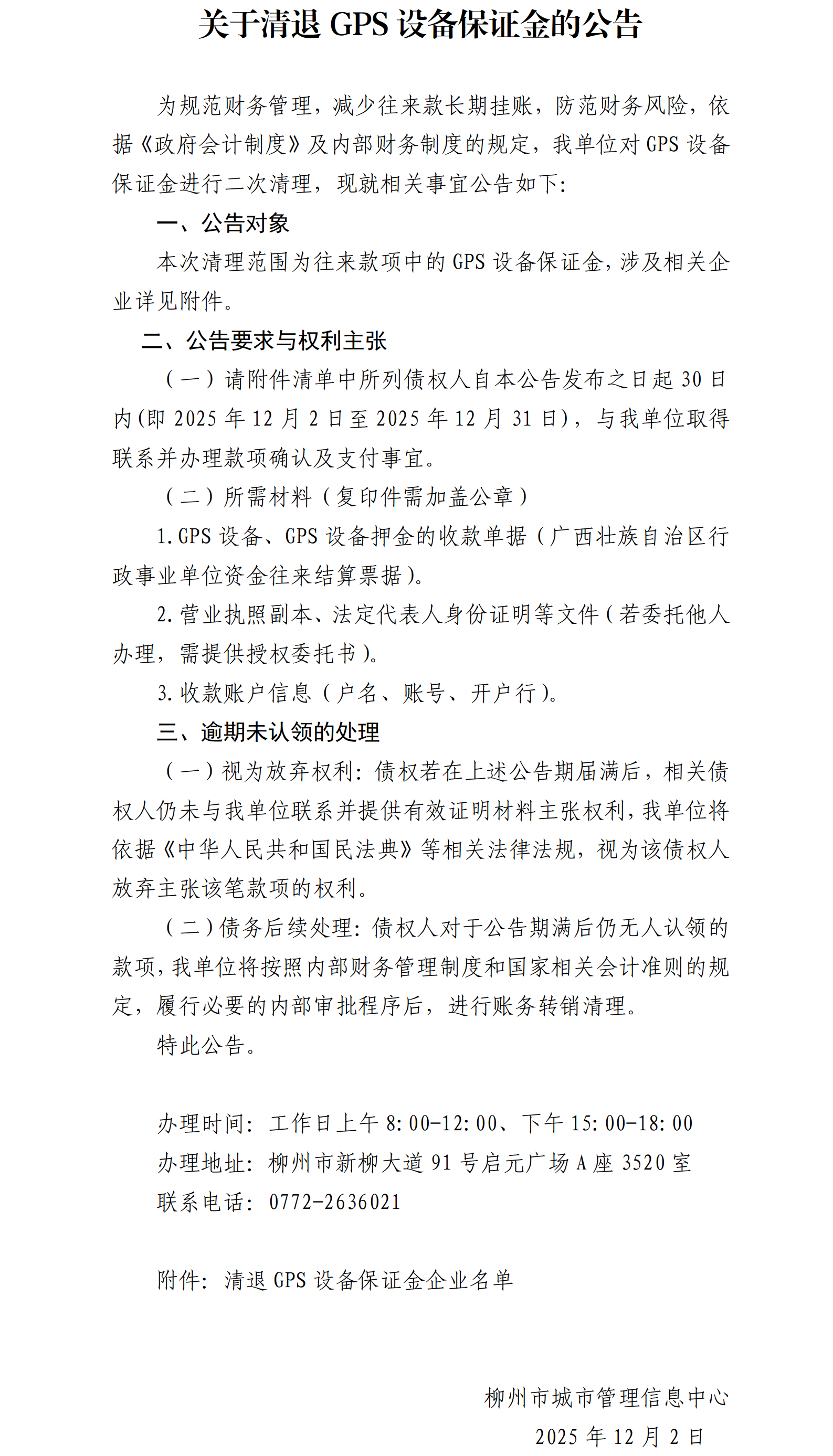 关于清退GPS设备保证金的公告