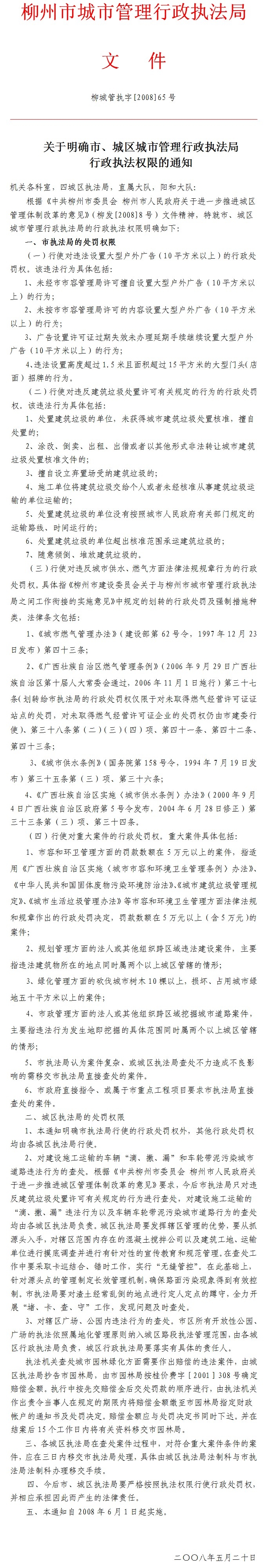 关于明确市、城区城市管理行政执法局行政执法权限的通知
